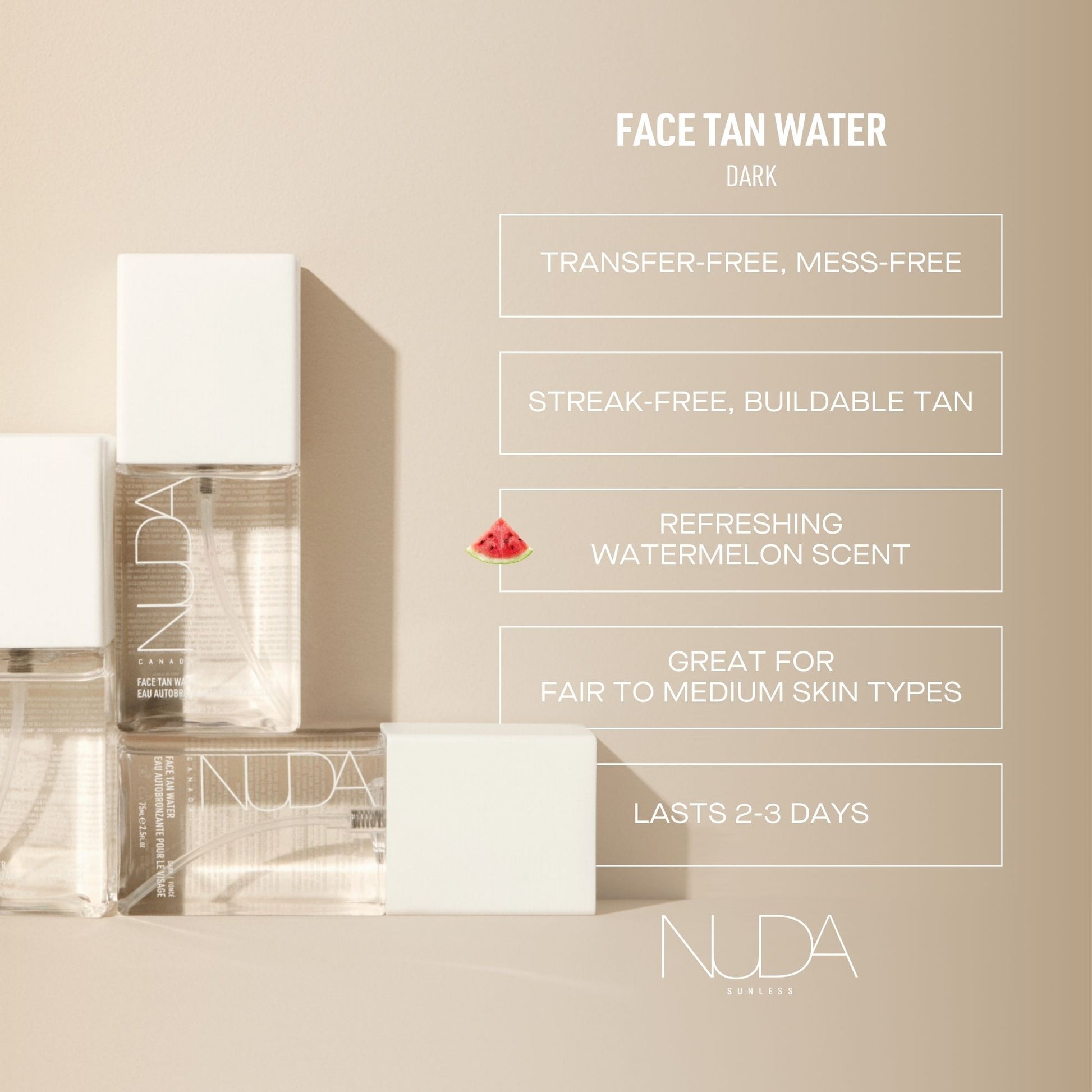 Face Tan Water is a clear, lightweight, non-sticky face tan water. Enriched with Aloe Vera, White Tea Extract, and Cucumber Extract, this hydrating self-tanner soothes and nourishes the skin. This skin-loving formula delivers a natural-looking deeper glow within 6 hours. Use this product to boost your glow 3-4 times a week, place under your skincare routine or on top of a moisturizer. The transfer-free, seamless MicroMist ensures a mess-free application, while its refreshing watermelon-scented formula offers a non-irritating radiant glow. Simply spritz, wait, rinse, and reveal your radiance!