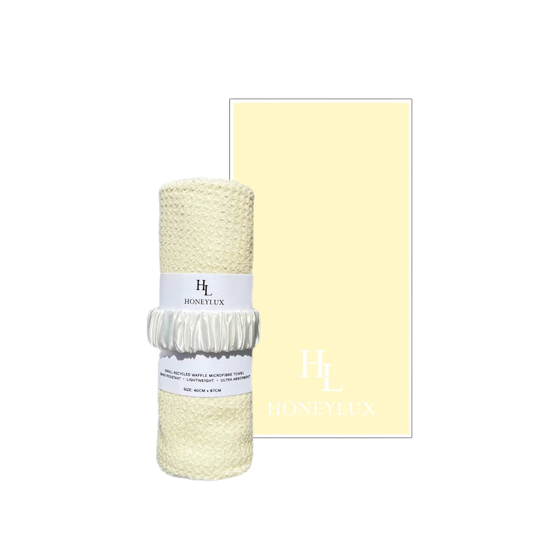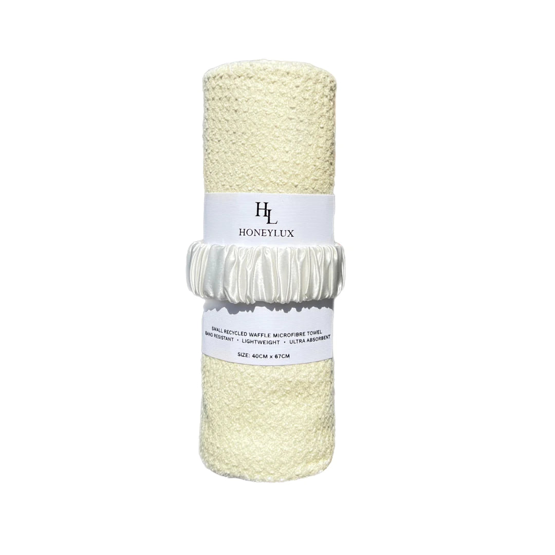 We’re proud to maintain our sustainability standards and use recycled microfibre. Each towel comes with a luxury silk band that can be used for travel or your hair!